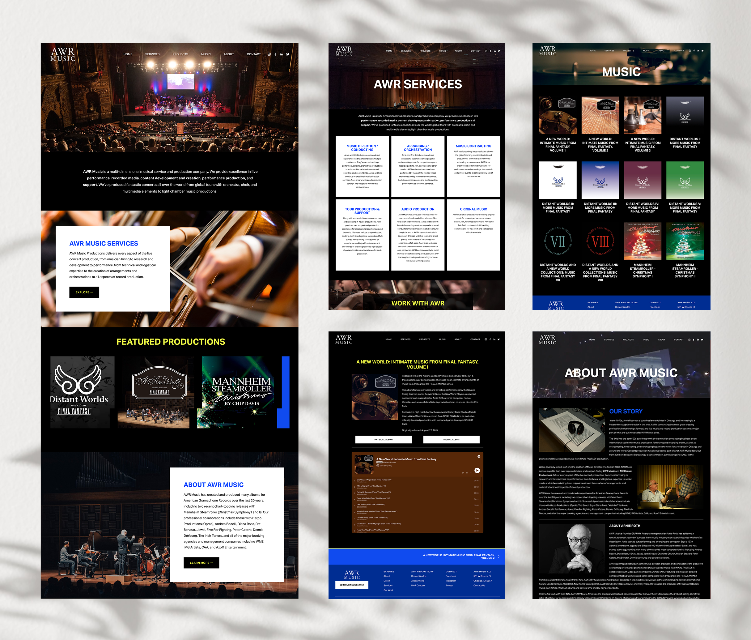 I had the thrilling opportunity to work with AWR Music to create a cohesive family of websites. We migrated their main site to Squarespace, establishing a dynamic hub for their diverse musical projects. By implementing fresh wireframing and engaging copy, I crafted an electrifying brand color palette and refined their content to highlight their expertise in live performance, recorded media, and production support.